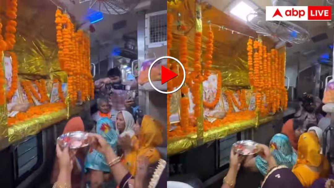 वायरल वीडियो में साफ देखा जा सकता है कि ट्रेन के एक कोच को पूरी तरह सजाकर मंदिर जैसा रूप दे दिया गया है. कोच की अपर बर्थ को पूरी तरह से मंदिर का स्थान जैसा सजाया गया है. अंदर देवी-देवताओं की तस्वीरें रखी गई हैं और चारों तरफ फूलों की मालाएं टंगी हुई हैं. कुछ लोग आरती करते नजर आ रहे हैं तो कुछ भजन गाते दिख रहे हैं. माहौल बिल्कुल किसी धार्मिक आयोजन जैसा नजर आता है, मानो ट्रेन नहीं बल्कि चलता-फिरता मंदिर हो.