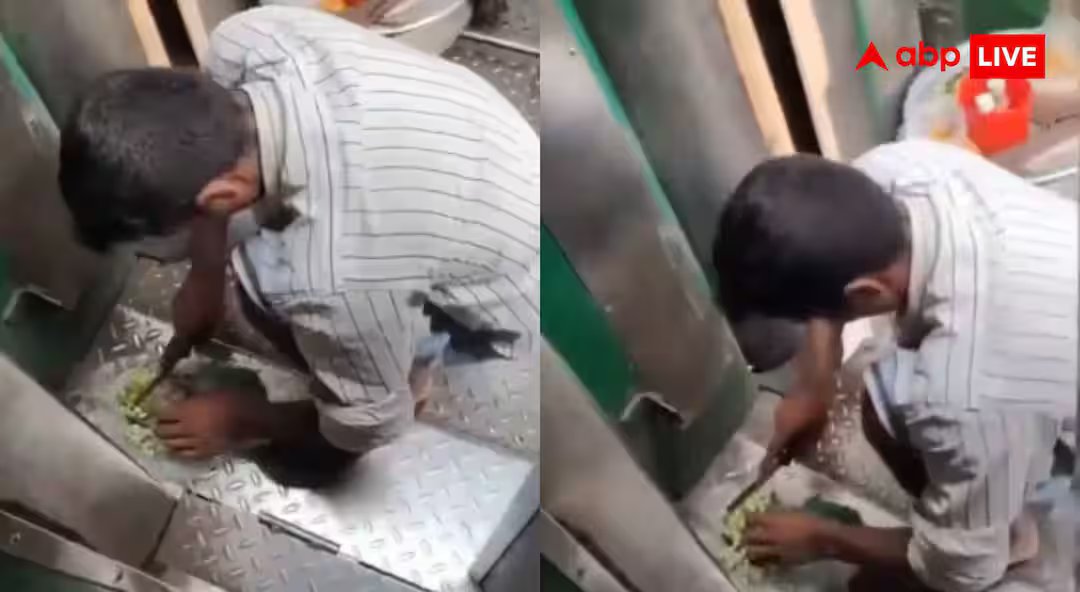 इस वायरल वीडियो में एक आदमी ट्रेन के अंदर, टॉयलेट के पास बैठा हुआ नजर आ रहा है. वह वहीं फर्श पर सब्जियां काट रहा है. जिस जगह पर लोग पैर रखने से भी कतराते हैं, उसी जगह पर वह खाने की तैयारी कर रहा है.उसके पास एक बर्तन और कुछ सामान भी रखा हुआ है, जिससे लगता है कि वह झालमुड़ी या चना जैसे स्नैक्स बेचने वाला है. उसने नीचे प्लास्टिक बिछाई हुई है, लेकिन फिर भी जगह बहुत गंदी दिख रही है.